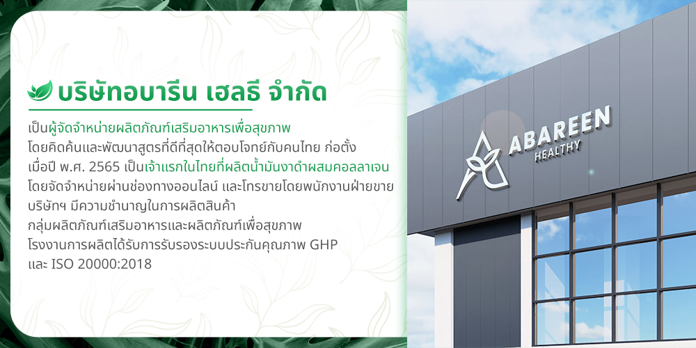 ผลิตภัณฑ์เสริมอาหารงาดำสกัดผสมคอลลาเจน ตราอบารีน (Black Sesame Oil With Collagen Dietary Supplement Product Abareen brand) อุดมไปด้วยสารอาหารที่จำเป็นต่อร่างกาย อาทิ แคลเซียม, เซซามิน, วิตามิน อี, โอเมก้า 3 และ โอเมก้า 6 เป็นต้น มีส่วนช่วยฟื้นบำรุงร่างกาย รวมถึง สุขภาพกระดูกและข้อเข่า